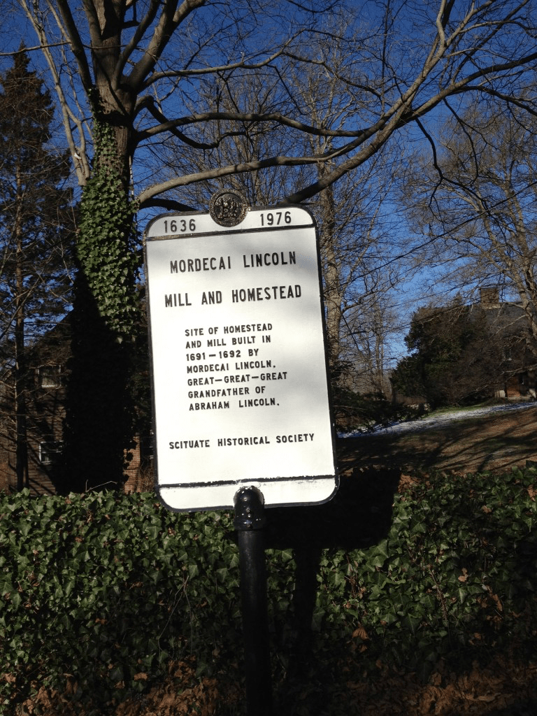 Mordicai was the second to be born to Samuel and Martha. His brother died in infancy. He  marries Sarah Jones or Hull in 1684 and they have son Mordecai Jr. in 1686. Mordecai Sr. was a blacksmith and served as a colonial foot soldier in 1679. He owned a gristmill in Hingham that today is called the Lincoln Antique Mill. His eldest son will also be a Mordicai. It is this Mordicai that begins the family journey to the west where Abraham will be born. During the President’s lifetime he probably knew little of his New England roots. Mordecai Sr. the blacksmith and mill owner dies in 1727 at 71 years of age, but not before giving birth to ancestor Issac in 1691. Issac was an infant when the Lincoln Mill was built in 1690. He marries Sarah Cummings of Scituate in 1716. Our ancestor Issac Lincoln Jr. is born in Hingham in 1717. Issac Jr. will continue to reside in Hingham where son Lazarus Adca Lincoln is born in 1756.
